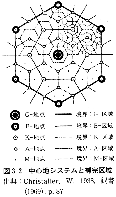 この3つを併せて、クリスタラーは「補給原理」を提示しました。国土のあらゆる部分に あらゆる中心的財を 最小数の中心地から供給するように都市が分布する、という原理です。この最小数の中心地というのがミソです。