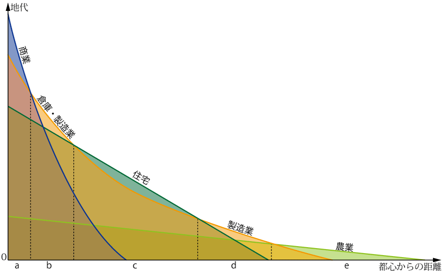 それぞれの土地において、最も高い地代を払ってくれる利用者に貸すと考えれば、自然とaの地域は商業、bの地域は倉庫業、cの地域は住宅、dの地域は製造業、eの地域は農業が卓越するようになります。都心に近いほど高密度で集約的な、遠ざかるほど低密度で粗放的な土地利用がなされます。