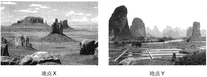 2. 世界各地では、その土地の気候条件や地質条件によって異なる侵食作用がはたらき、多様な地形がみられる。次の写真1は、それぞれ図1中の地点XとYで撮影されたものである。写真1にみられる地形を説明した下の文章中の空欄エとオに当てはまる語句の正しい組み合わせを、下の1〜4のうちから一つ選べ。