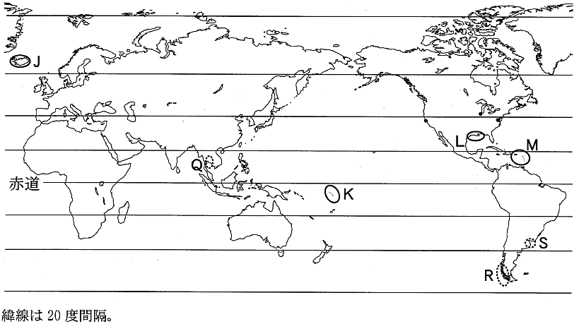 3. 次の1〜4の文は、図2中のJ〜Mのいずれかの地域における自然環境の特徴について述べたものである。Mに該当するものを1〜4のうちからひとつ選べ。