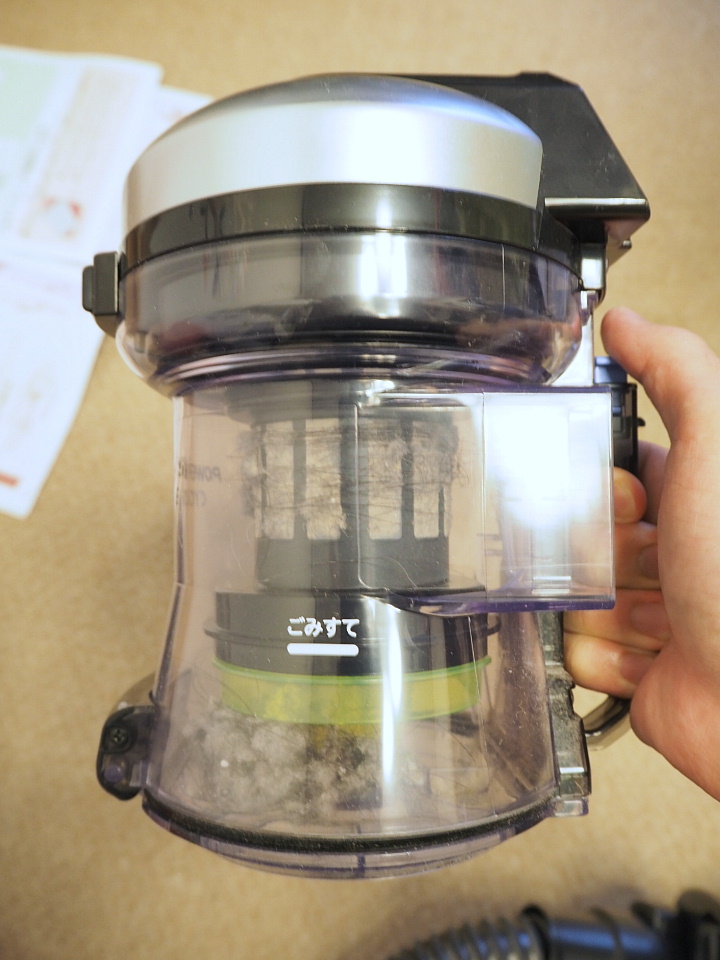 ただし、「基本的には」というのがミソで、掃除機が指示している「ゴミ捨てライン」を無視して掃除をすると悲惨なことになる。上の写真がゴミを溜めるタンクなのだが、このゴミ捨てラインより上にゴミが溜まってしまうと、構造上ゴミが出にくくなっている。紙パックならガンガン吸って、パンパンになってもまだまだ吸って、パック代をケチるのじゃ! みたいな精神こそが正義であったけれど、サイクロン式ではそれは通用しない。こまめに捨てようね。