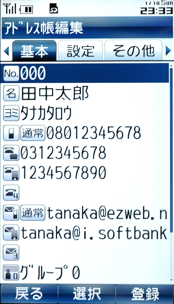 適当な名前、番号でかまわない。登録したい内容をすべて埋めるようにしておく。
