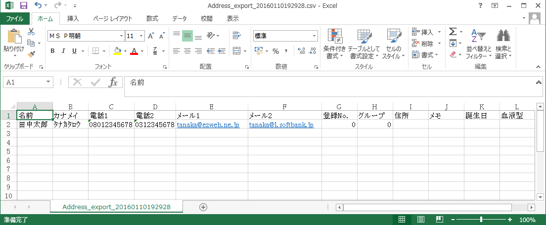 変換したら、項目の順序、入り方を確認する。あとは、スマートフォンから取り込んだcsvデータを、これと同じ形に合わせて作り、vcf形式に変換してガラケーに入れてやれば良いだけだ。